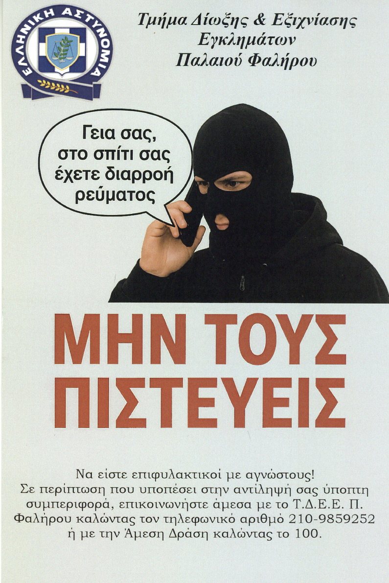 Τύπωσαν φυλλάδια με απλές, κατανοητές αλλά πολύ χρήσιμες συμβουλές και πήγαν σε ΚΑΠΗ, καφενεία, καφετέριες, σε θεατρικές παραστάσεις που τις παρακολουθούν μεγαλύτεροι προκειμένου να προειδοποιήσουν για τους τηλεφωνικούς απατεώνες που παρουσιάζονται ως λογιστές, υπάλληλοι του ΔΕΔΔΗΕ και ότι άλλο μπορούν να σκαρφιστούν για να αποκτήσουν πρόσβαση στο εσωτερικό των σπιτιών και να αρπάξουν χρήματα και κοσμήματα. Η αρχική ιδέα, σύμφωνα με πληροφορίες του astinomiko.gr, ξεκίνησε από το Τμήμα Δίωξης και Εξιχνίασης Εγκλημάτων Γαλατσίου σε μια προσπάθεια αντίδρασης και, κυρίως, ενημέρωσης.