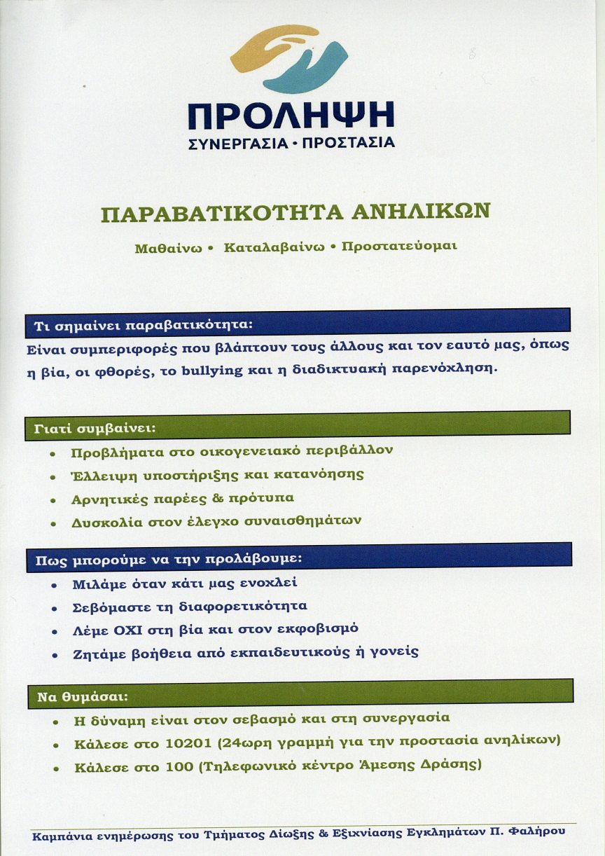 Παράλληλα, στο Παλαιό Φάληρο τύπωσαν και ένα φυλλάδιο που αφορά στην παιδική παραβατικότητα, ένα φαινόμενο που τα τελευταία χρόνια ολοένα και περισσότερο προκαλεί «πονοκέφαλο» στην εκπαιδευτική κοινότητα, τις οικογένειες αλλά και την αστυνομία. Τα τηλέφωνα 10201 και το 100 είναι δυο αριθμοί που ο οποιοσδήποτε μπορεί να καταγγείλει περιστατικό που αφορά την παραβατικότητα ανηλίκων.