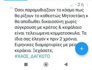 «Όσοι παραμυθιάζουν τον κόσμο πως ρίξουν το καθεστώς Μητσοτάκη και θα αποδωθεί δικαιοσύνη χωρίς σύγκρουση με το κράτος και το κεφάλαιο είναι τελειωμένα κομματόσκυλα. Τα ίδια σας έλεγαν και πριν 2 χρόνια. Ειρηνικές διαμαρτυρίες με ρεσώ και κεράκια. Ξεχάσατε; #ΧΑΟΣ_ΔΑΓΚΩΤΟ» έγραφε ο συλληφθείς.