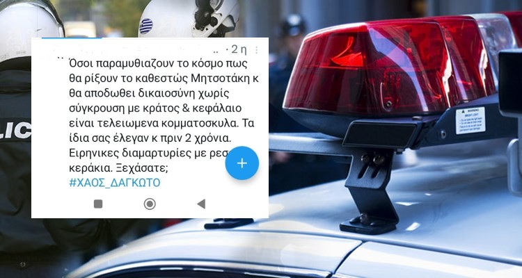 «Όσοι παραμυθιάζουν τον κόσμο πως ρίξουν το καθεστώς Μητσοτάκη και θα αποδωθεί δικαιοσύνη χωρίς σύγκρουση με το κράτος και το κεφάλαιο είναι τελειωμένα κομματόσκυλα. Τα ίδια σας έλεγαν και πριν 2 χρόνια. Ειρηνικές διαμαρτυρίες με ρεσώ και κεράκια. Ξεχάσατε; #ΧΑΟΣ_ΔΑΓΚΩΤΟ» έγραφε ο συλληφθείς.