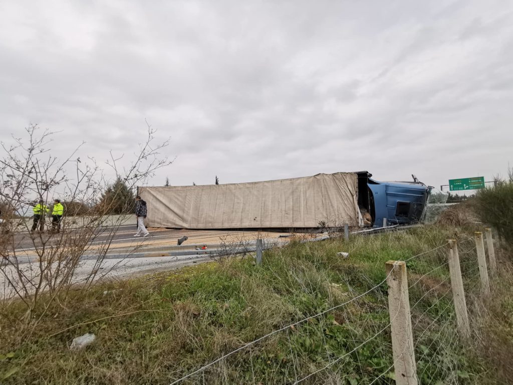Η νταλίκα “ξάπλωσε” στο οδόστρωμα, κλείνοντας τελείως την Εθνική οδό, με αποτέλεσμα η Τροχαία να διακόψει την κυκλοφορία και να την εκτρέψει μέσω του Κιλελέρ.