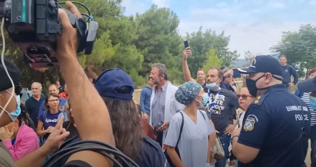 Έξω από το κτήριο είχαν συγκεντρωθεί ανεμβολίαστοι υγειονομικοί, οι οποίοι τον αποδοκίμασαν τόσο κατά την άφιξη, όσο και κατά την αποχώρησή του.