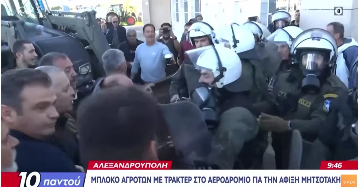 Ένταση υπήρξε το πρωί της Τρίτης (11/11) μεταξύ αγροτών και αστυνομικών δυνάμεων στο αεροδρόμιο Αλεξανδρούπολης κατά την άφιξη του Κυριάκου Μητσοτάκη ο οποίος περιοδεύει στην Θράκη.