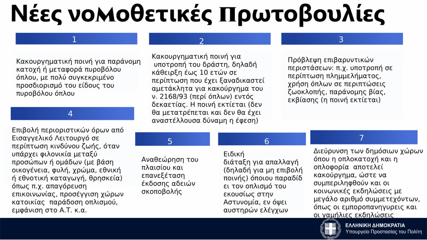- Αναθεώρηση του πλαισίου έκδοσης αδειών οπλοφορίας. Εξετάζονται αλλαγές στις προϋποθέσεις και στις διαδικασίες απόκτησης νόμιμης άδειας.