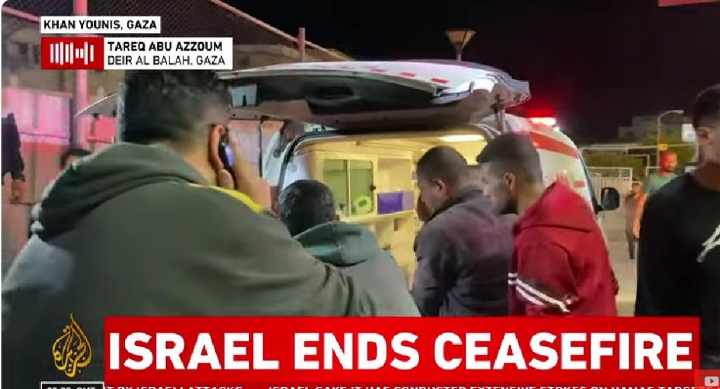 Νωρίτερα, ο Ύπατος Αρμοστής του ΟΗΕ για τα Ανθρώπινα Δικαιώματα Φόλκερ Τουρκ δήλωσε «τρομοκρατημένος» από την επανέναρξη των ισραηλινών βομβαρδισμών και ζήτησε «να τελειώσει άμεσα ο εφιάλτης».