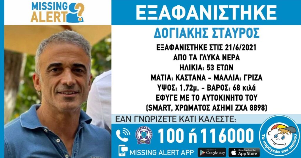 Εκτεταμένες έρευνες και ενεργοποίηση του μηχανισμού “missing alert” του “Χαμόγελου του Παιδιού”, έχει προκαλέσει η εξαφάνιση του Σταύρου Δογιάκη, ιδιοκτήτη τη διάσημης ταβέρνας “Κρητικός” στην Κάντζα.