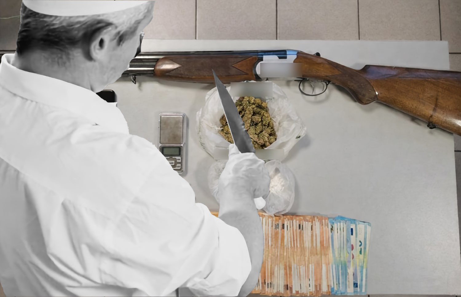 Συγκεκριμένα κατασχέθηκαν δύο ακόμη νάιλον συσκευασίες με κοκαΐνη συνολικού βάρους 26,8 γραμμαρίων, μία συσκευασία με ακατέργαστη κάνναβη βάρους 40 γραμμαρίων, ηλεκτρονική ζυγαριά με υπολείμματα κοκαΐνης, το ποσό των 11.000 ευρώ καθώς και ένα κυνηγετικό όπλο τύπου δίκαννο, για το οποίο δεν υπήρχε σχετική άδεια.