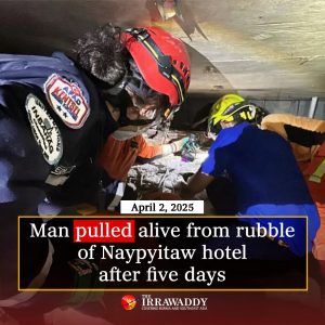 A man was rescued Wednesday after being trapped for five days under the collapsed Hotel Aye Chan Thar in Naypyitaw’s Ottarathiri Township, according to the Myanmar Fire Services Department, which worked with a Turkish rescue team. #WhatsHappeningInMyanmar pic.twitter.com/kHlHCrHlIL