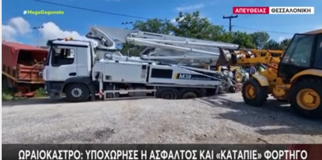 Αλαλούμ προκλήθηκε το πρωί της Τετάρτης, 14 -5 στο Ωραιόκαστρο Θεσσαλονίκης, όταν ξαφνικά υποχώρησε η άσφαλτος σε κεντρικό δρόμο και ένα φορτηγό έπεσε μέσα στην τρύπα που δημιουργήθηκε.