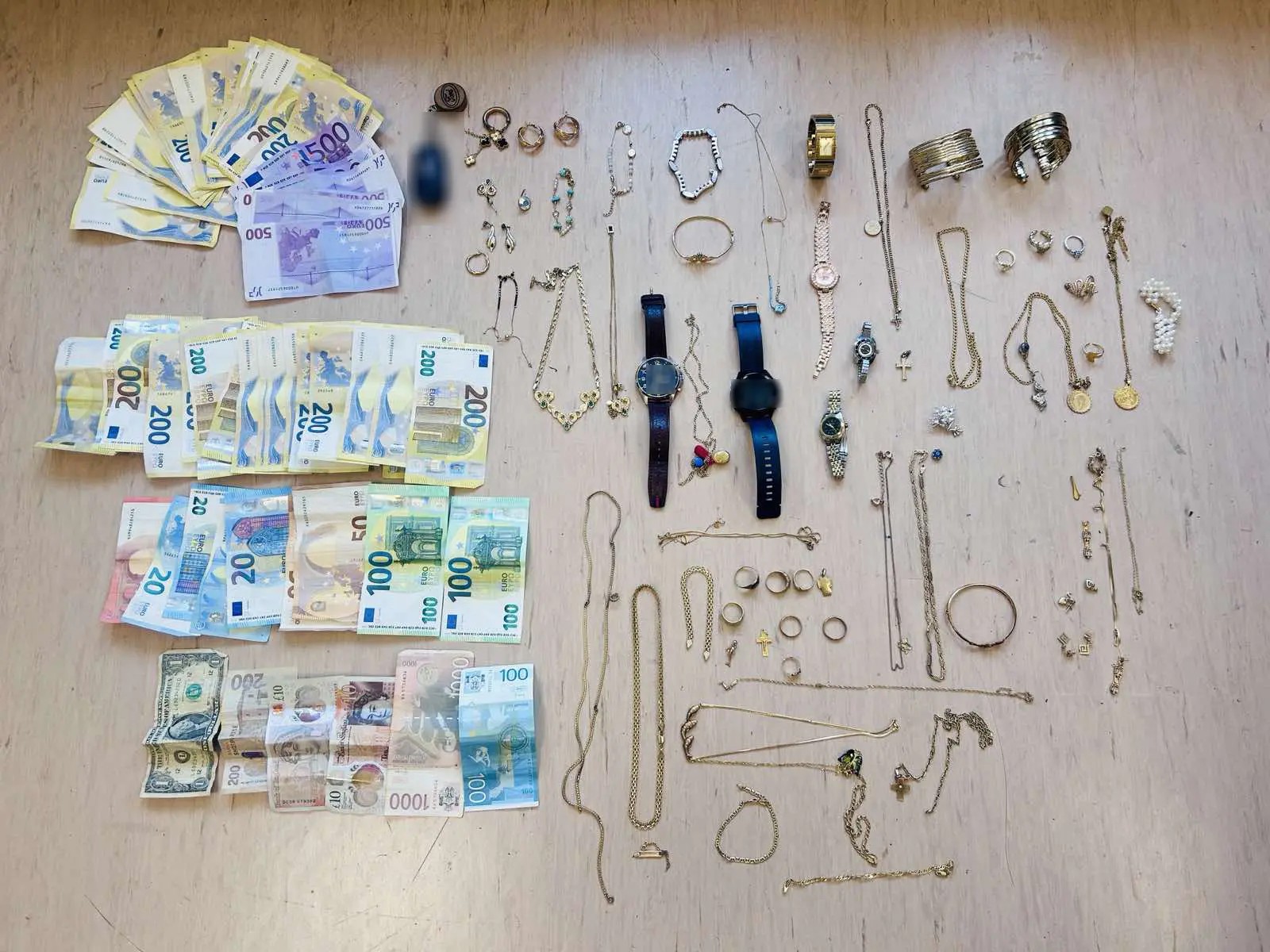 Κατά τις έρευνες που πραγματοποιήθηκαν σε οικία, οχήματα, καθώς και στην κατοχή των κατηγορουμένων, βρέθηκαν συνολικά και κατασχέθηκαν πληθώρα χρυσαφικών, το χρηματικό ποσό των -12.100- ευρώ και άλλα αντικείμενα.