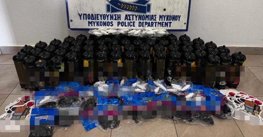 Συνελήφθησαν χθες (1 Ιουλίου 2025) στη Μύκονο, από αστυνομικούς της Υποδιεύθυνσης Αστυνομίας Μυκόνου, τρείς αλλοδαποί ηλικίας 21, 23 και 24 ετών οι οποίοι κατείχαν με σκοπό την εμπορεία συσκευασίες με «αέριο γέλιου».