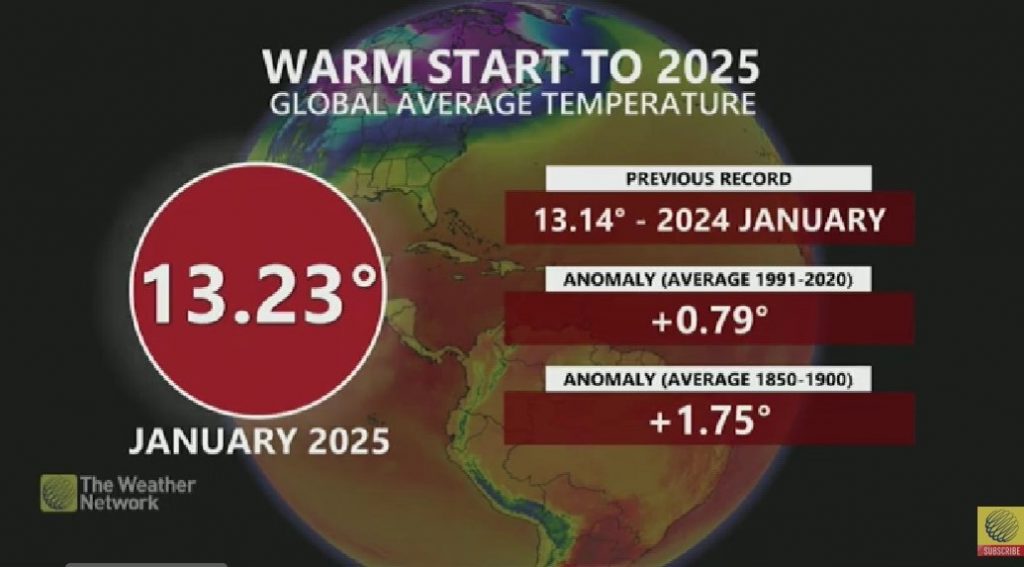 Καθώς η μέση θερμοκρασία επιφανείας έφθασε τους 13,23 ° Κελσίου, σύμφωνα με το παρατηρητήριο Κοπέρνικος, τον Ιανουάριο του 2025 η θερμοκρασία ήταν υψηλότερη «κατά 1,75 ° Κελσίου» σε σύγκριση με την προβιομηχανική εποχή, προτού οι άνθρωποι αρχίσουν να αλλάζουν το κλίμα με τη μαζική χρήση άνθρακα, πετρελαίου και αερίου για την παραγωγή ενέργειας και άλλους σκοπούς.