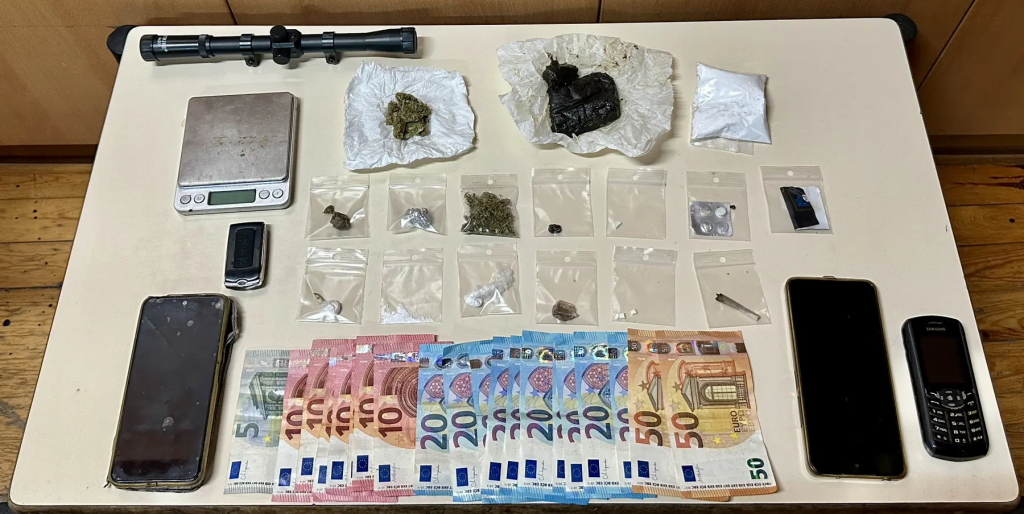 Μετά από έρευνα οι αστυνομικοί βρήκαν και κατάσχεσαν μεταξύ άλλων 76,2 γραμμάρια κατεργασμένης κάνναβης «σοκολάτα», μικροποσότητα κοκαΐνης και ηρωίνης, 2 ζυγαριές ακριβείας αλλά και χρηματικό ποσό.
