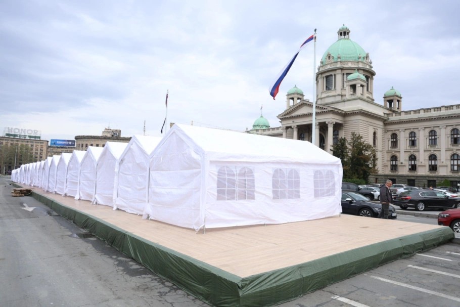 Η κατασκήνωση στην λεωφόρο μπροστά από την βουλή και στο πάρκο του προεδρικού μεγάρου στήθηκε τον περασμένο Μάρτιο από φοιτητές που υποστηρίζουν τον Αλεξάνταρ Βούτσιτς και αντιτίθενται στις αντικυβερνητικές κινητοποιήσεις.