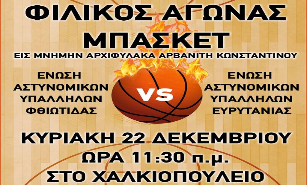 Η Ένωση Αστυνομικών Υπάλληλων Φθιώτιδας θα πραγματοποιήσει φιλικό αγώνα καλαθοσφαίρισης με την Ένωση Αστυνομικών Υπάλληλων Ευρυτανίας, υπό την αιγίδα του Δήμου Λαμιέων, στη μνήμη του συναδέλφου και μέλους μας, αείμνηστου Αρχιφύλακα ΑΡΒΑΝΙΤΗ Κωνσταντίνου, ο οποίος την 15η Ιουλίου του 2015 υπηρετών στο Α.Τ. Αμφίκλειας, έχασε τη ζωή του από την επάρατη
