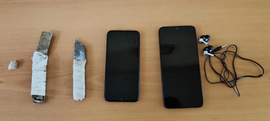 Ειδικότερα, στο πλαίσιο των ερευνών που πραγματοποιήθηκαν, παρουσία εισαγγελικού λειτουργού, σε κελιά και χώρους του Σωφρονιστικού Καταστήματος βρέθηκαν και κατασχέθηκαν -2- αυτοσχέδια μαχαίρια, -2- κινητά τηλέφωνα, ζεύγος ακουστικών, καθώς και -0,4- γραμμάρια ναρκωτικής ουσίας.