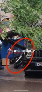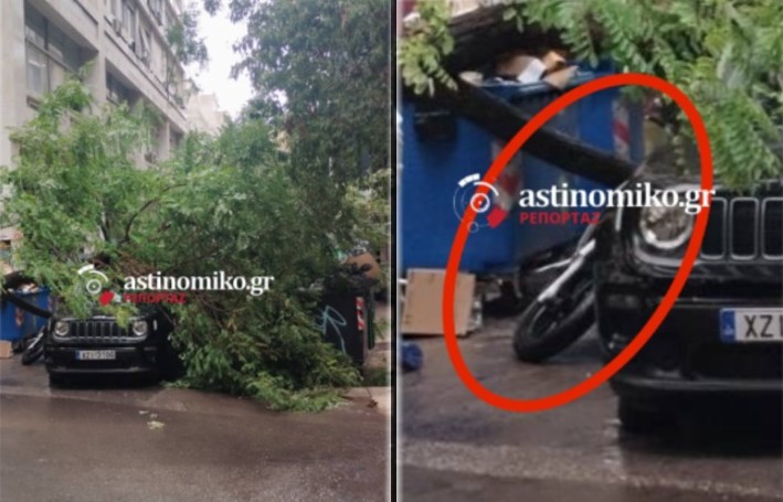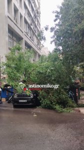 Όπως βλέπετε και στις φωτογραφίες-ντοκουμέντο του astinomiko.gr το δέντρο που ξεριζώθηκε έπεσε πάνω σε ένα αυτοκίνητο και ένα μηχανάκι.