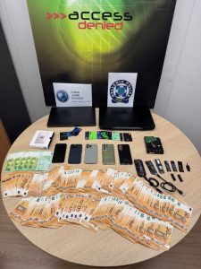 Στην οικία του βρέθηκαν χρεωστικές τραπεζικές κάρτες, -15.205- ευρώ, -8.134,56- ευρώ σε κρυπτονομίσματα, «ψηφιακό πορτοφόλι», -7- σκληροί δίσκοι, κινητά τηλέφωνα, USB κ.α.